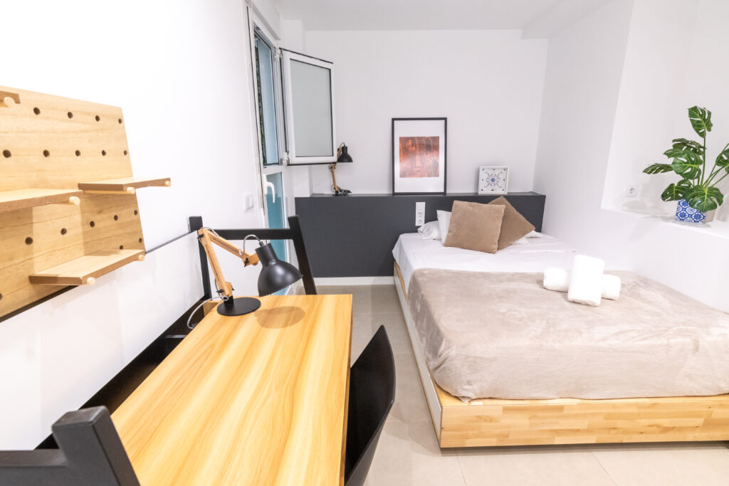 Estudio abuhardillado, con un amplio ventanal al cielo. Dispone de 30m2 con una cocina equipada, un completo y moderno baño privado.